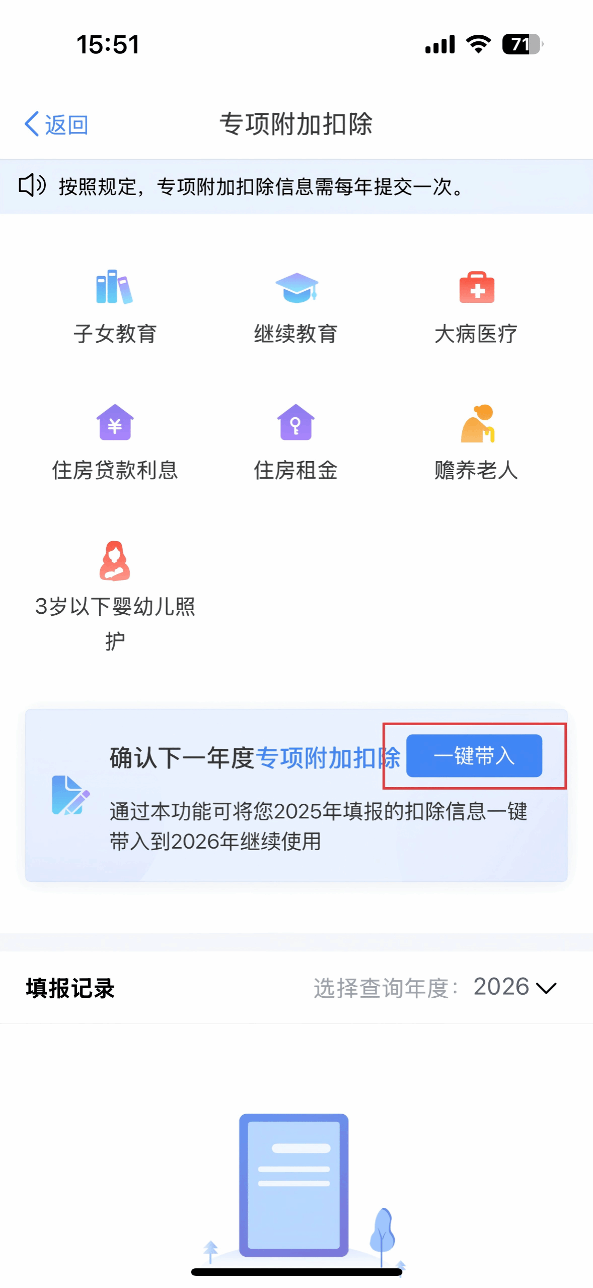 打开个人所得税APP办&查,选择“专项附加扣除”,选择“一键带入”,选择扣除年度“2026”。如下图所示: